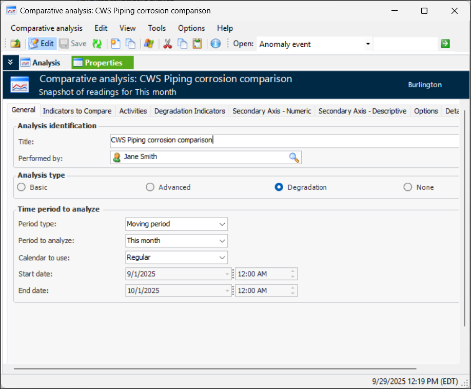 Tip: Comparative analyses can also be created from a failure mode in a risk-based inspection analysis. In the Maintenance Action Plan window, select the Degradation Rates view and the Comparative Analyses tab and click New. This feature is not available for failure modes created for the damage mechanisms library.