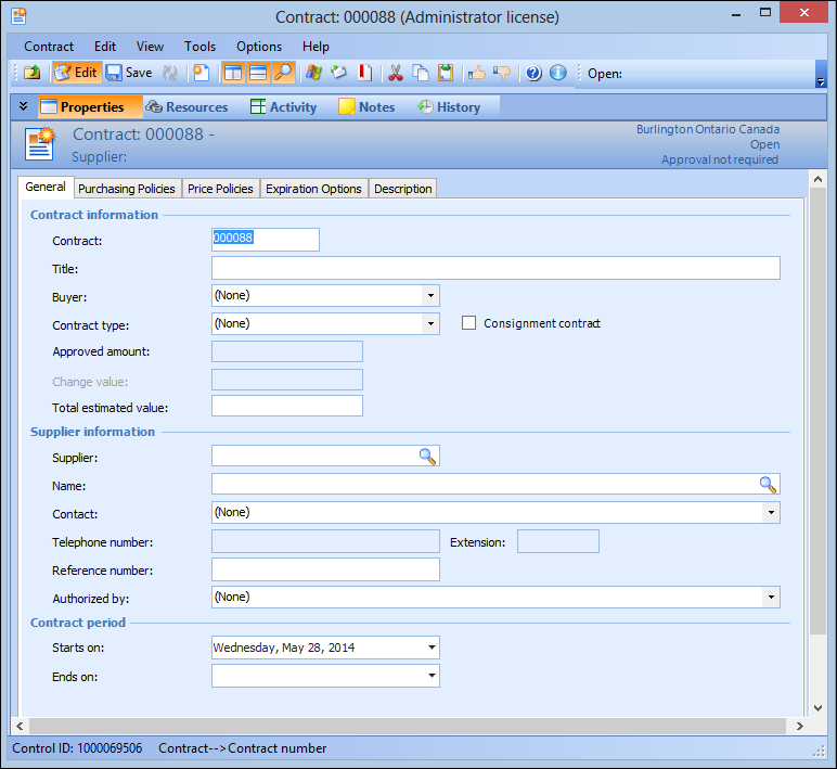 3. Click New. The Contract window appears.