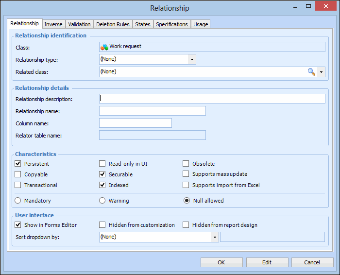 16. On the Specifications tab, you can enter a detailed description of the relationship.Note: On the States tab, you can review the state groups in which this relationship is included. To create custom states for the relationship, see Creating Custom States. On the Usage tab, you can review the views where the relationship appears in the user interface.