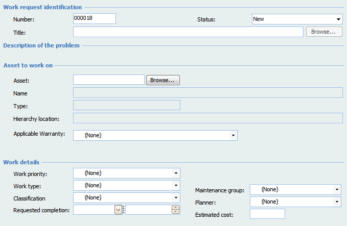 27. Move the Applicable Warranty field underneath the Hierarchy location field (in the Asset to Work on section of the General tab). To do this, you will first need to move some of the other fields down. You can also resize the Applicable Warranty field to match the sizes of the other fields in the view. When you are finished, the dialog should look similar to this: