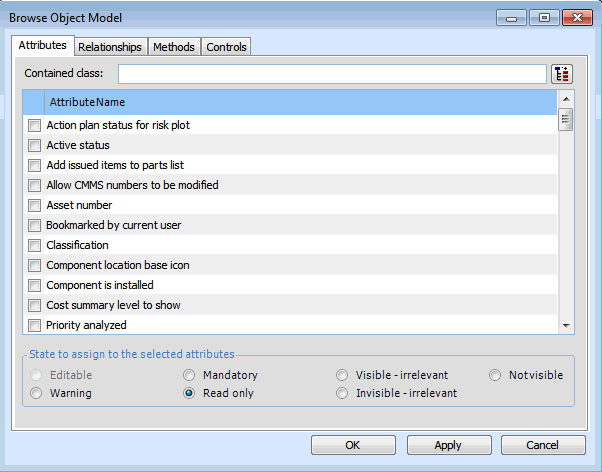• Invisible - irrelevant: This option is only available for custom attributes and relationships. You cannot set base APM attributes or relationships to visible - irrelevant.