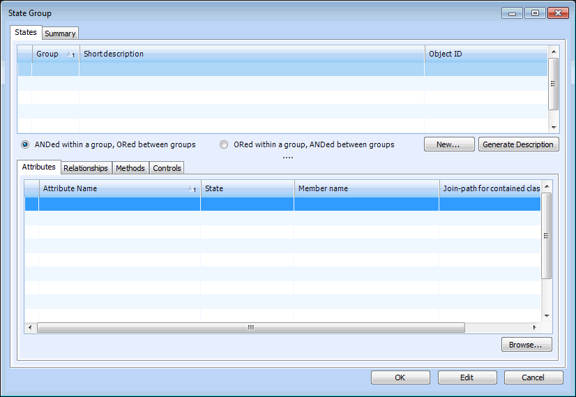 • ORed within a group, ANDed between groups: items within the same group are evaluated with ORs; items in different groups are evaluated with ANDs.Select the attributes, relationships, methods, and pages affected by the state group