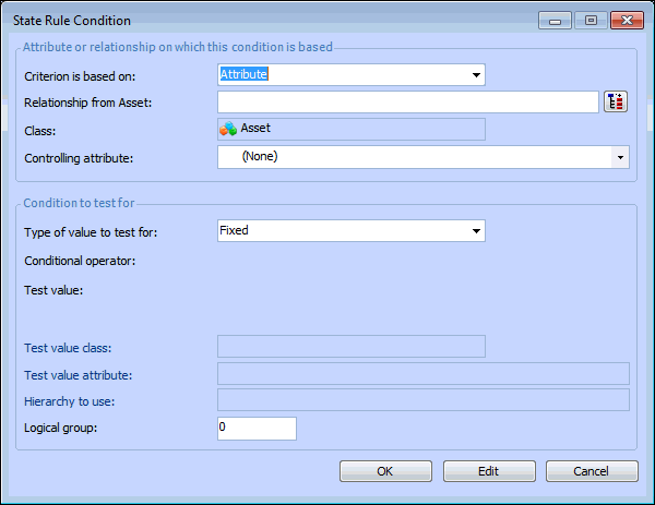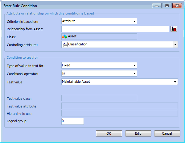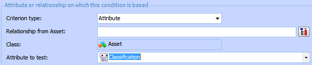 If you are basing the condition on an attribute in either the class being customized or a related class, select Attribute. For example, Classification is an attribute of the Asset class.However, if the condition is to be based on the content of a relationship, select the Relationship option. For example, Asset Type (along with other value lists) is a separate class that is related to the Asset class.