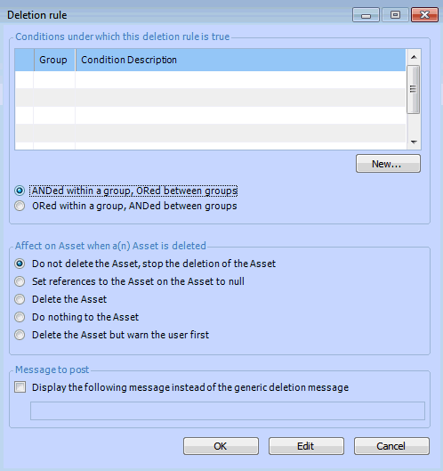 3. To add exceptions to the default behavior, click New. The Deletion rule dialog appears.