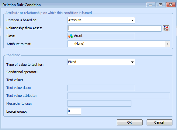 If you are basing the condition on an attribute in either the class being customized or a related class, select Attribute. For example, Classification is an attribute of the Asset class.However, if the condition is to be based on the content of a relationship, select the Relationship option. For example, Asset Type (along with other value lists) is a separate class that is related to the Asset class.