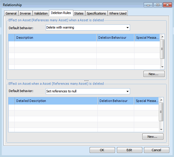 • Do nothing: Nothing happens to the related object. (Not available for Scopes, Scoped by, References many, Referenced by many, or Referenced by relationship types.)