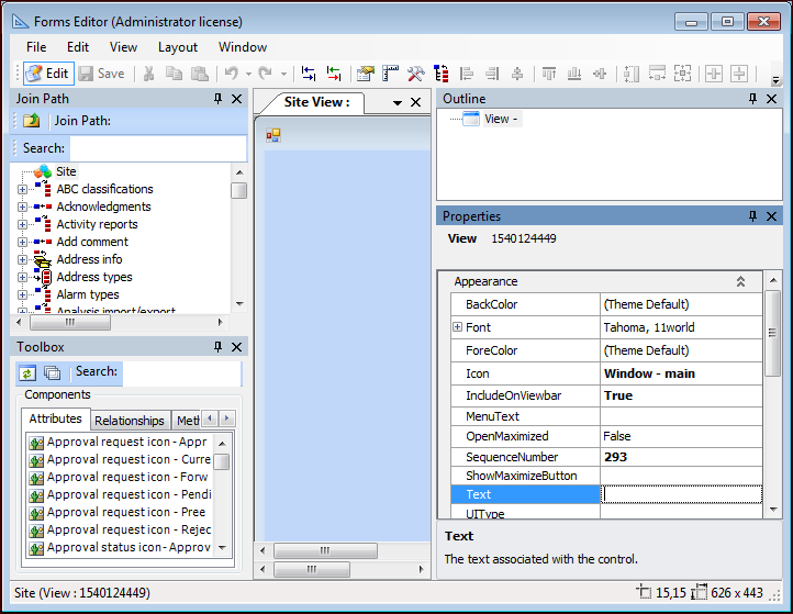 12. Now you can begin adding controls to the view. Attributes, enumerated lists, methods, and relationships all appear in the Toolbox. Note that unless you override the default name for a custom relationship, it will appear in the layout using the relationship type (for example, References One) followed by the name of the linked class. You can add items from other related classes by opening the Class field in the Join Path panel, following the join path, and selecting the appropriate class.Find the attributes or relationships that you want in the Toolbox, and drag the elements onto your view.Note: If you add a relationship that references multiple objects (such as references many, or scopes), a table control (MCLB) will be used. When you add a table, you will probably want to modify the default table configuration for the view. To do this, see Adding a Table Configuration to a View.