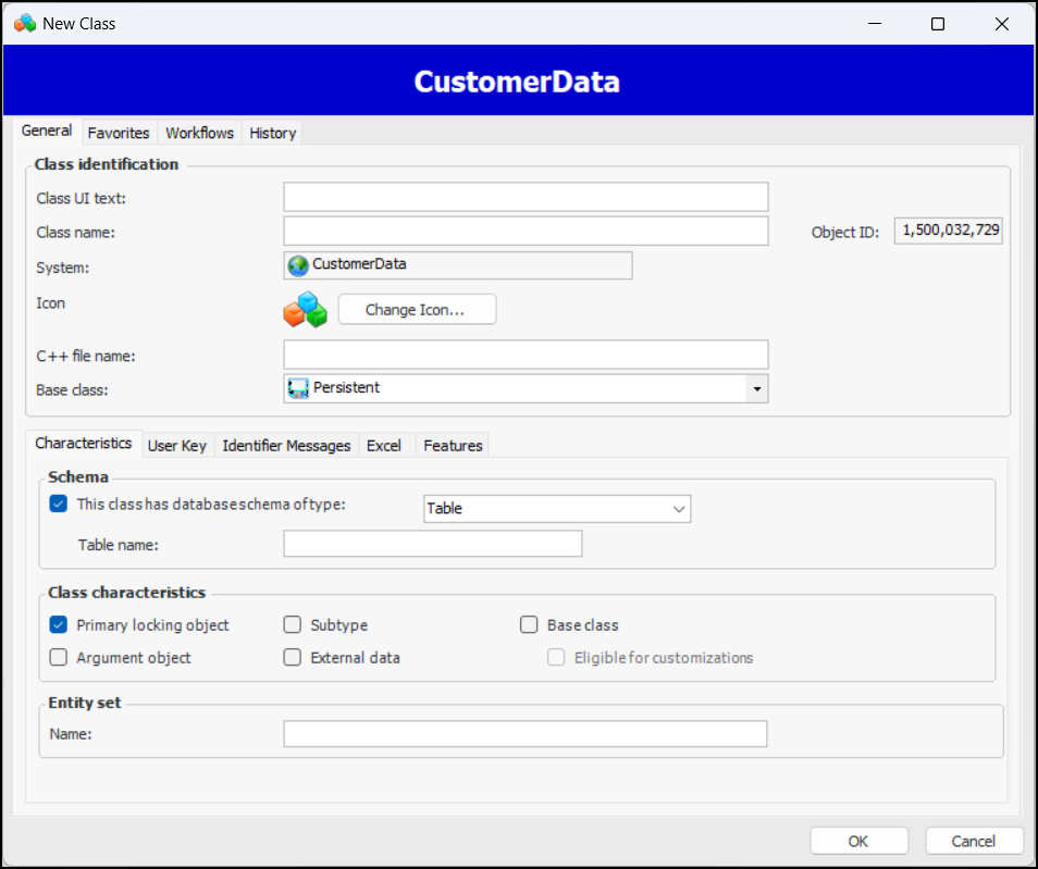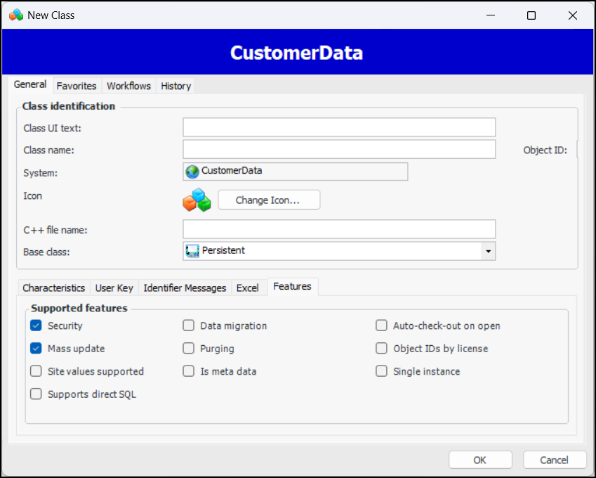 7. Select Base class if the class is a base class, then select Eligible for use in customizations if this class will be used as a base class for custom classes.