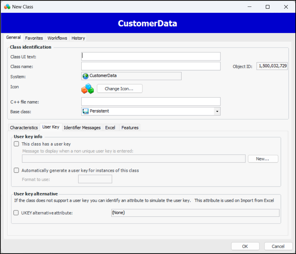 8. Select the User Key tab and then select This class has a user key and Automatically generate the user key for instances of this class.You are not required to enter a value in the Format to use field.Tip: For more information about these options, press F1 on any field.
