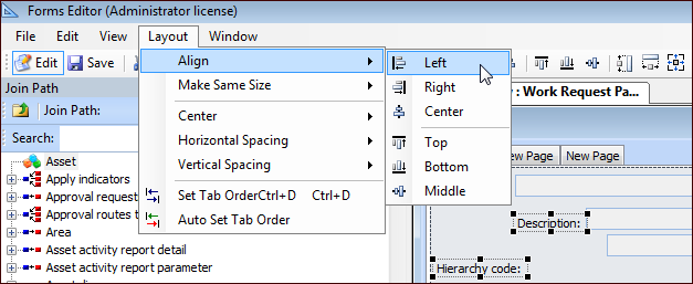 12. You can add controls from other related classes by expanding the hierarchy in the Join Path panel, following the join path, and selecting the appropriate class. The attributes, methods, relationships, and panels for the join path appear in the Toolbox panel.Once you have found the element that you want, drag it from the Toolbox onto your view.Tip: To quickly arrange fields and/or labels in a window, you can use the Layout menu options. Select two or more items in the window, and then select a layout option from the menu.