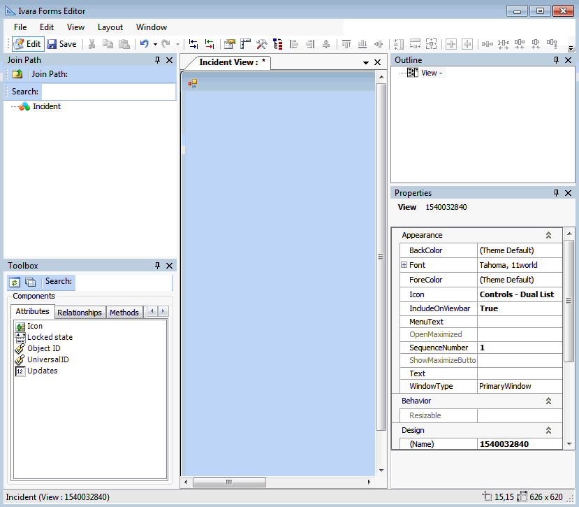 11. Now you can begin adding controls to the view. Attributes, enumerated lists, and relationships all appear in the Toolbox panel. Note that unless you override the default name for a custom relationship, it will appear in the palette using the relationship type (for example, References One) followed by the name of the linked class.
