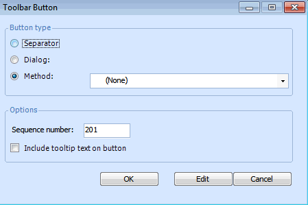• Method: adds a button that runs a method. When you select this option, you can select from any method available in the system.