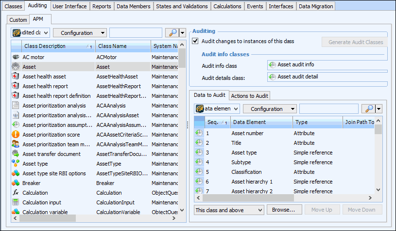 3. Select the Auditing tab. The Custom tab lists all audited custom classes. The APM tab lists all audited base APM classes. For example, select the APM tab and then select an audited class from the table on the right. Its audited data elements and actions are listed on the appropriate tabs on the right:Note: Audit information cannot be directly altered on an APM base class. You must first create a custom class based on an APM class and modify the audited properties of the custom class. For more information, see Enabling Auditing for a Custom Class.