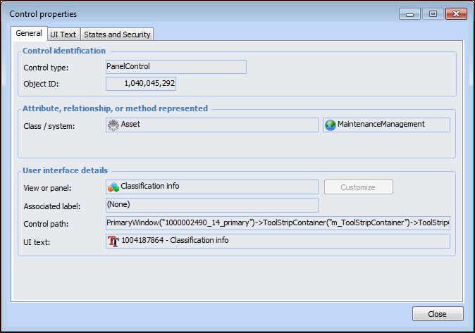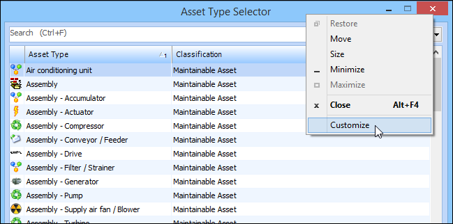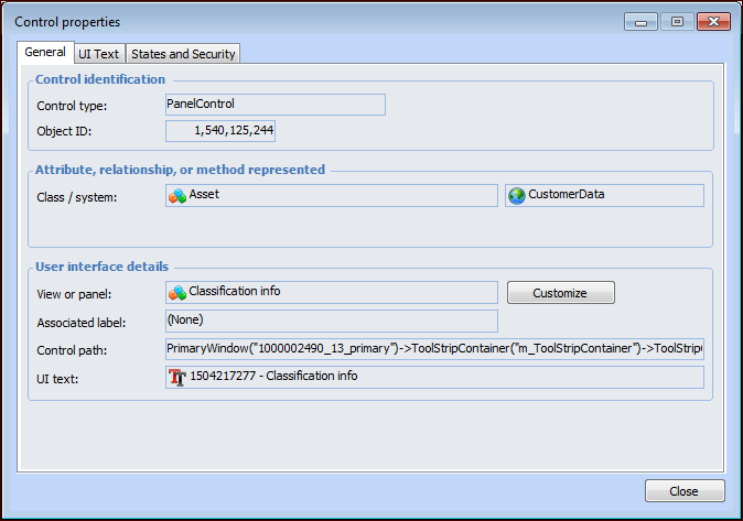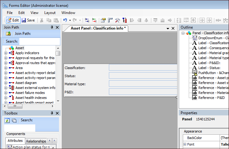 3. To edit the view or panel, click Customize. The Forms Editor appears, for example:Tip: You can right-click the banner of a dialog and select Customize to invoke the Forms Editor directly from the UI, rather than launching the Forms Editor from the Customization Center view. For example:
