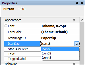 6. In the Properties panel, Appearance section, click the box beside IconImageID, and select a pre-defined icon to represent your button. The button automatically resizes to fit the image.