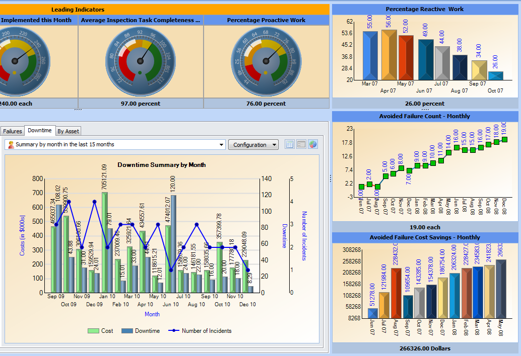 All types of dashboards are assigned to APM users in their employee records. Site dashboards appear in the user’s Dashboard view. The user’s assigned sidebar dashboards can appear throughout the product, for example, on the Assets view, Listing tab. Standard sidebar dashboards can also appear on object windows, for example, in the Asset window’s Strategy Development view. My desk dashboards appear in the user’s My Desk view.A list of predefined panels is available to select from when you are setting up a dashboard to use a site panel, KPI panel, or AHI panel. Examples of these panels are “Dashboard - Degradation rate summary - by indicator”, “My desk - Planner panel”, and “KPI gauges panel - Aligned horizontally”. (If the dashboard section displays KPI or AHI panels, you would also select the indicators or indexes to show in the panel.) It is also possible to create custom panels to show in dashboards, as well as copying existing dashboards by using the Customization Center. For more information, see Customization Guide.Site Dashboards