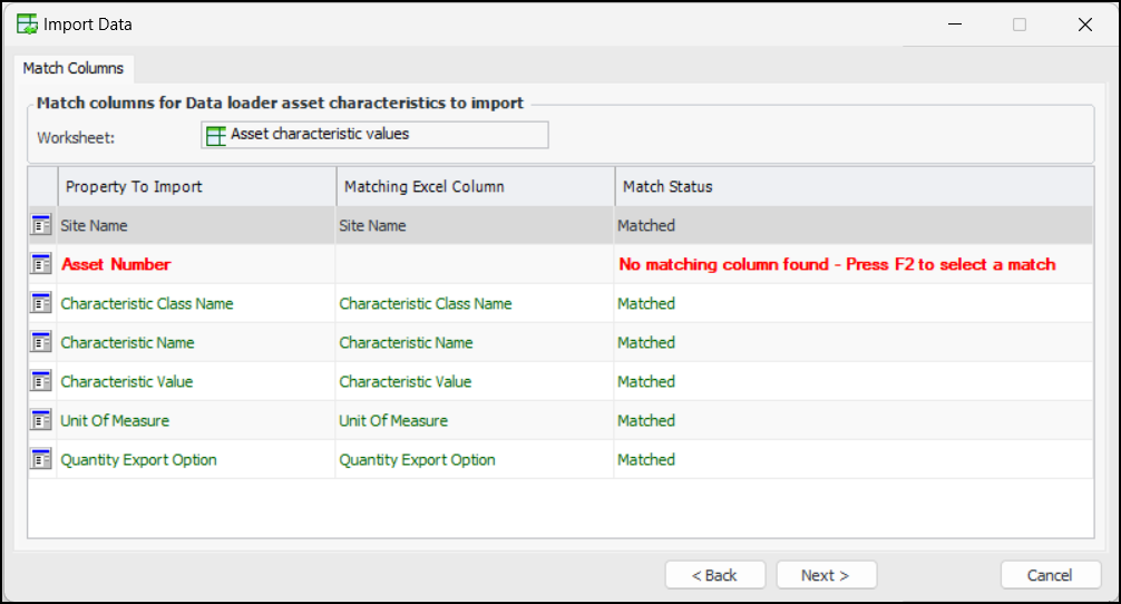6. Click Next. The Match Columns page lists the properties to import, the columns in the Excel file, and their match statuses. If the matching criteria is “Headings in first row” and a column does not match, the row appears in red. The Match Status column indicates the reason for the error. For example:Tip: In an error row, you can click the Matching Excel Column cell and press F2 to make the cell editable. Then select a column from the import file to match.