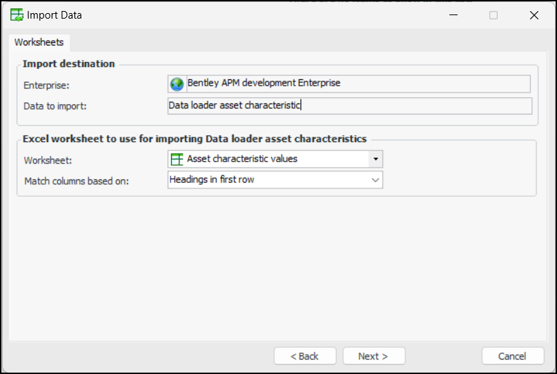 When you wish to populate assets in an APM database with asset characteristics, APM data loading provides an alternative to manual data entry: you can import characteristics from a Microsoft Excel® workbook. You can also update existing asset characteristics using the Import Data wizard.Note: To use this functionality in APM, you must first enable feature 23. In the Enterprise window, select the Customization Center view and the Enabled Features tab. Click Browse, select “Asset characteristics”, and click OK. If APM is running as a smart client, click Refresh Enabled Features on the server. Then restart the client to use the functionality.Processing Options