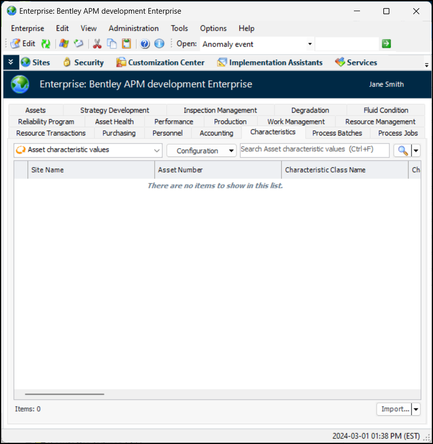 1. In the Enterprise window, select the Data Loaders view and Characteristics tab. In the list of configurations, select “Asset characteristic values”. The tab displays the staging table of asset characteristics that have been imported.