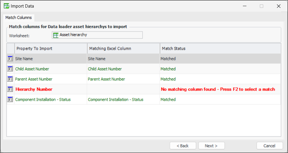 8. Click Next. The Match Columns page lists the properties to import, the columns in the Excel file, and their match statuses. If a column does not match, the row appears in red, and the Match Status column indicates the reason for the error. For example:Tip: In an error row, you can click the Matching Excel Column cell and press F2 to make the cell editable. Then select a column from the import file to match.
