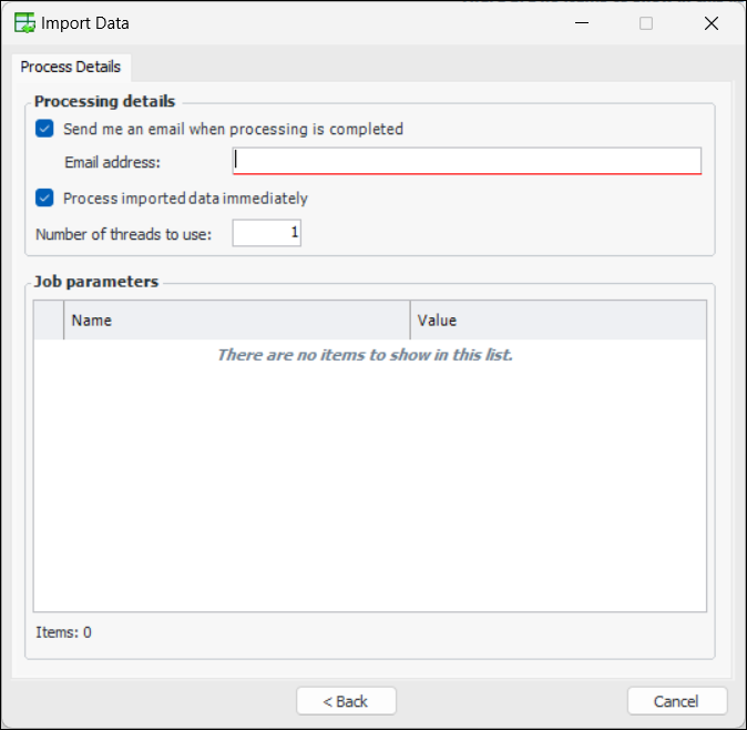 10. Send an email when this job finishes is selected by default. If you would like an email notification to be sent to you or another employee, enter a valid email address in the Email address box.Note: In order for APM to send automatic email notifications, the recipient’s employee record must record the email address and server email settings must include the SMTP host name. For more information, “Setting up Email” in APM Installation Guide.