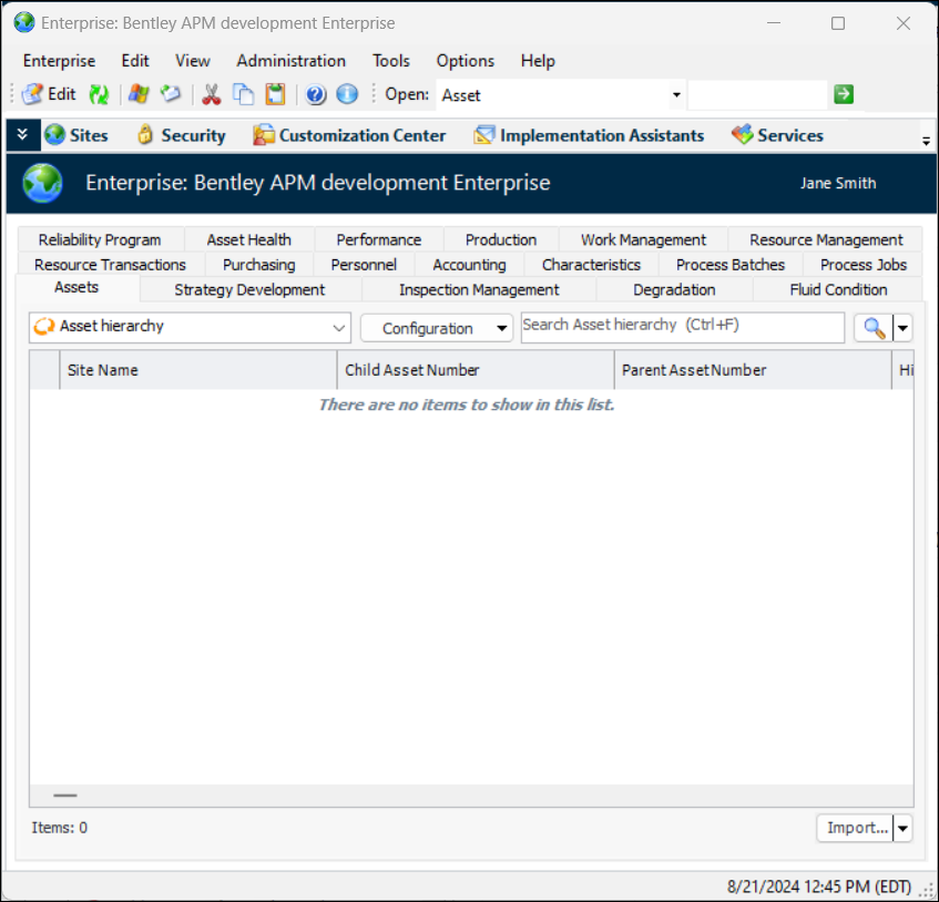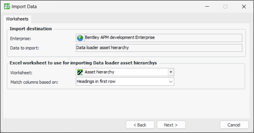 When you have imported assets using APM data loading, you can then import the data that builds the asset hierarchy. You can also update existing hierarchy information. First, populate a Microsoft Excel® workbook with the data. Then use the Import Data wizard to copy the data from the worksheet to an APM staging table.While using the Import Data wizard, you can set an option to process data immediately. If no errors are found in the imported data, the data is added to the specified APM site. If you do not select Process Immediately, the job remains in the process jobs queue until processing is initiated.After the information has been processed, an entry appears in the Data Import Requests tab on the Data Management view. The import worksheet and a results worksheet that includes each record’s import status and error, if any, are attached to the import request.Tip: After importing asset hierarchy information, you can re-sequence the assets in APM. For more information, see Resequencing Assets in a Hierarchy.