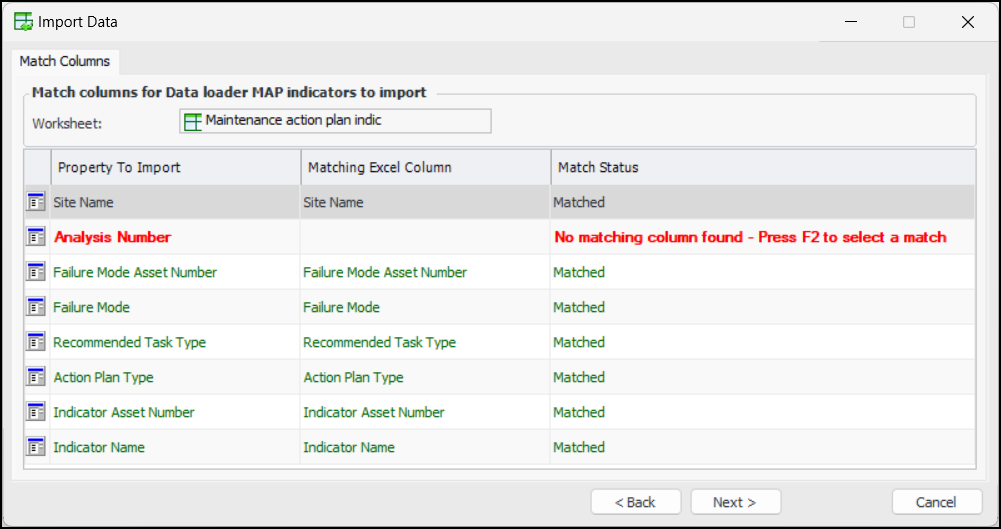 8. Click Next. The Match Columns page lists the properties to import, the columns in the Excel file, and their match statuses. If the matching criteria is “Headings in first row” and a column does not match, the row appears in red. The Match Status column indicates the reason for the error. For example:Tip: In an error row, you can click the Matching Excel Column cell and press F2 to make the cell editable. Then select a column from the import file to match.