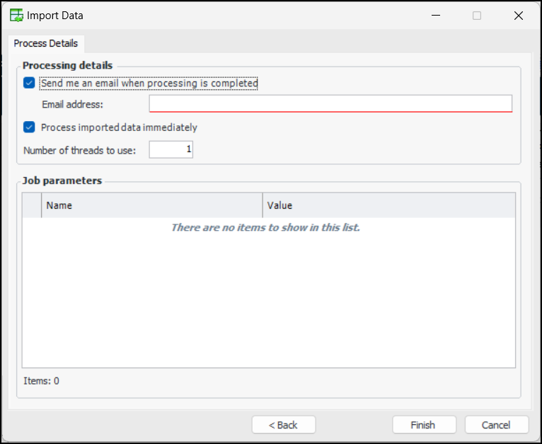 10. Send an email when this job finishes is selected by default. If you would like an email notification to be sent to you or another employee, enter a valid email address in the Email address box.Note: In order for APM to send automatic email notifications, the recipient’s employee record must record the email address and server email settings must include the SMTP host name. For more information, “Setting up Email” in APM Installation Guide.