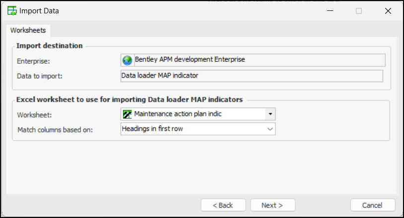 While using the Import Data wizard, you can set an option to process data immediately. If no errors are found in the imported data, the data is added to the specified APM site. If you do not select Process Immediately, the job remains in the process jobs queue until processing is initiated.After the information has been processed, an entry appears in the Data Import Requests tab on the Data Management view. The import worksheet and a results worksheet that includes each record’s import status and error, if any, are attached to the import request.Data Imported