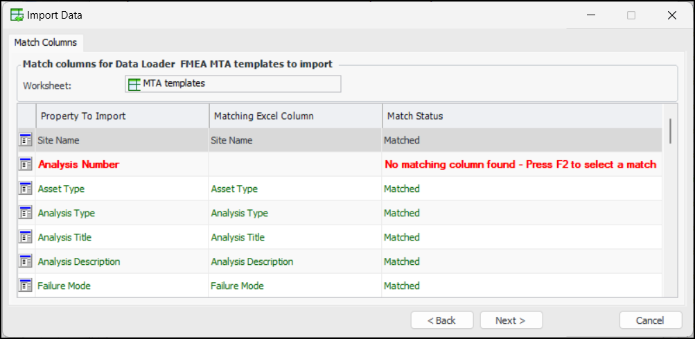 8. Click Next. The Match Columns page lists the properties to import, the columns in the Excel file, and their match statuses. If the matching criteria is “Headings in first row” and a column does not match, the row appears in red. The Match Status column indicates the reason for the error. For example:Tip: In an error row, you can click the Matching Excel Column cell and press F2 to make the cell editable. Then select a column from the import file to match.
