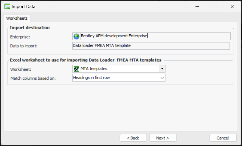 Using the data loader for MTA2 templates, you can import analysis templates, failure modes, and action plans from Microsoft Excel® workbooks into an APM database. For each row in the worksheet, the data loader does the following:Processing Options