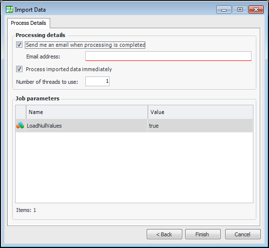 10. Send an email when this job finishes is selected by default. If you would like an email notification to be sent to you or another employee, enter a valid email address in the Email address box.Note: In order for APM to send automatic email notifications, the recipient’s employee record must record the email address and server email settings must include the SMTP host name. For more information, “Setting up Email” in APM Installation Guide.