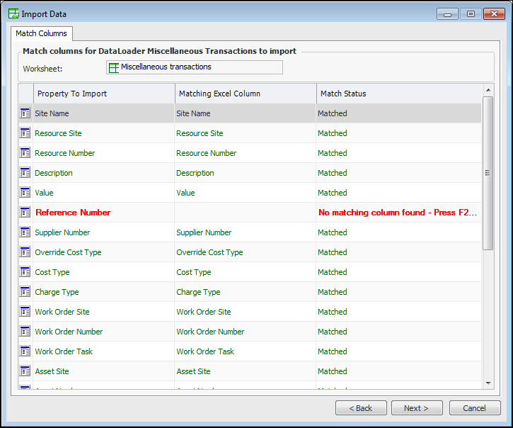 8. Click Next. The Match Columns page lists the properties to import, the columns in the Excel file, and their match statuses. If a column does not match, the row appears in red, and the Match Status column indicates the reason for the error. For example:Tip: In an error row, you can click the Matching Excel Column cell and press F2 to make the cell editable. Then select a column from the import file to match.