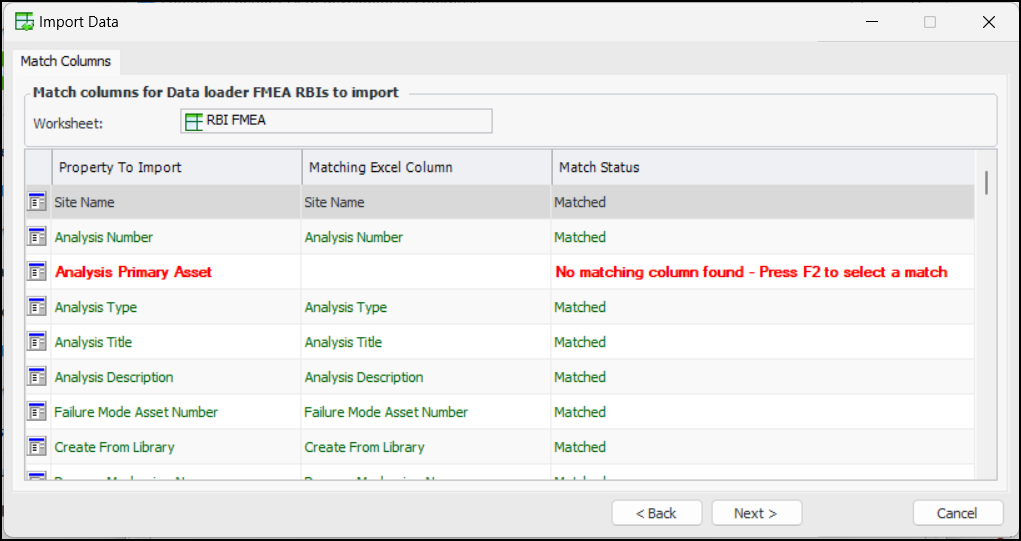 8. Click Next. The Match Columns page lists the properties to import, the columns in the Excel file, and their match statuses. If the matching criteria is “Headings in first row” and a column does not match, the row appears in red. The Match Status column indicates the reason for the error. For example:Tip: In an error row, you can click the Matching Excel Column cell and press F2 to make the cell editable. Then select a column from the import file to match.