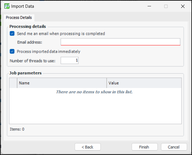 10. Send an email when this job finishes is selected by default. If you would like an email notification to be sent to you or another employee, enter a valid email address in the Email address box.Note: In order for APM to send automatic email notifications, the recipient’s employee record must record the email address and server email settings must include the SMTP host name. For more information, “Setting up Email” in APM Installation Guide.
