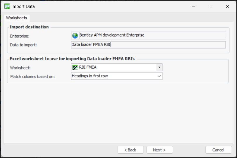Using the data loader for RBI, you can import analyses, analysis assets, failure modes, and action plans from Microsoft Excel® workbooks into an APM database. For each row in the worksheet, the data loader does the following:Processing Options