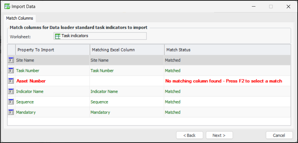 8. Click Next. The Match Columns page lists the properties to import, the columns in the Excel file, and their match statuses. If a column does not match, the row appears in red, and the Match Status column indicates the reason for the error. For example:Tip: In an error row, you can click the Matching Excel Column cell and press F2 to make the cell editable. Then select a column from the import file to match.