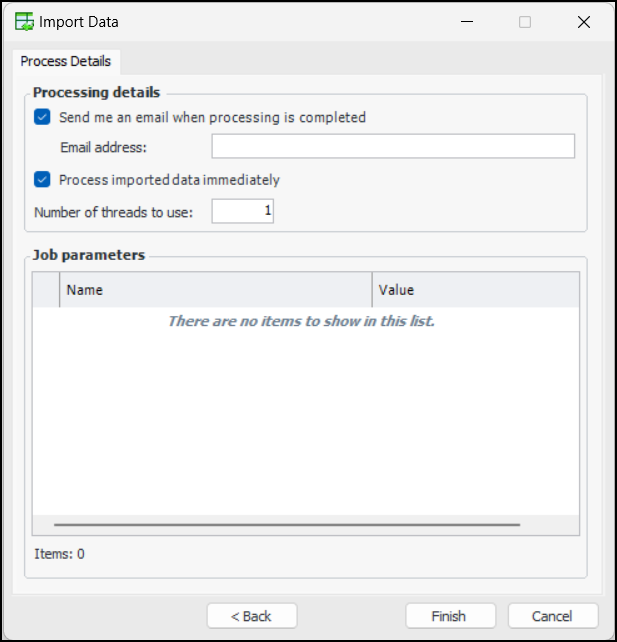 10. Send an email when this job finishes is selected by default. If you would like an email notification to be sent to you or another employee, enter a valid email address in the Email address box.Note: In order for APM to send automatic email notifications, the recipient’s employee record must record the email address and server email settings must include the SMTP host name. For more information, “Setting up Email” in APM Installation Guide.