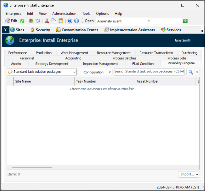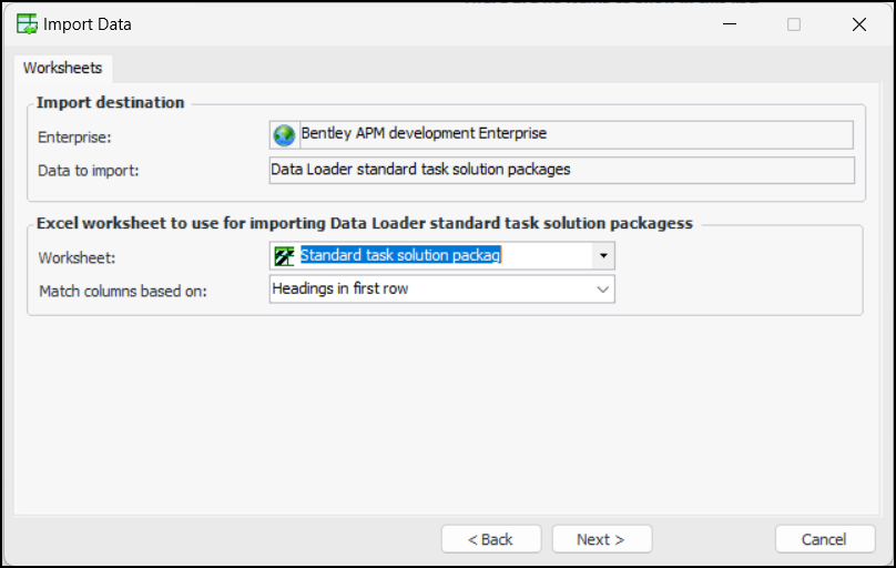 Note: Solution packages on standard tasks and the data loader are “generally available” product features. You must first enable features 119 and 122 to use the functionality in APM. In the Enterprise window, select the Features view and the Enabled Features tab. Click Browse, select “Solution package identification on standard task” and “Standard task solution package data loader” and click OK. If APM is running as a smart client, click Refresh Enabled Features on the server. Then restart the client to use the functionality.While using the Import Data wizard, you can set an option to process data immediately. If no errors are found in the imported data, the data is added to the specified APM site. If you do not select Process Immediately, the job remains in the process jobs queue until processing is initiated.After the information has been processed, an entry appears in the Data Import Requests tab on the Data Management view. The import worksheet and a results worksheet that includes each record’s import status and error, if any, are attached to the import request.
