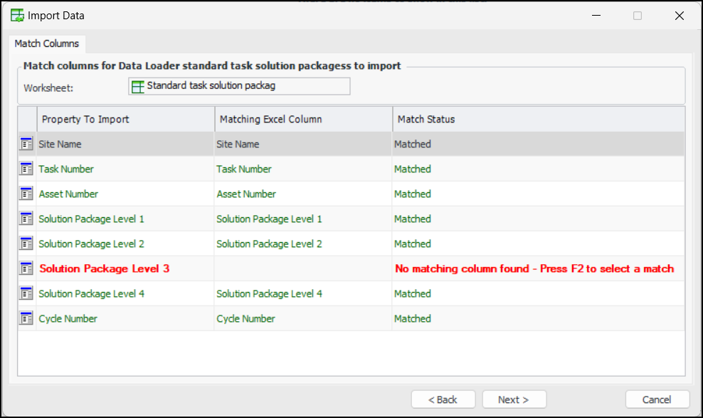 8. Click Next. The Match Columns page lists the properties to import, the columns in the Excel file, and their match statuses. If a column does not match, the row appears in red, and the Match Status column indicates the reason for the error. For example:Tip: In an error row, you can click the Matching Excel Column cell and press F2 to make the cell editable. Then select a column from the import file to match.