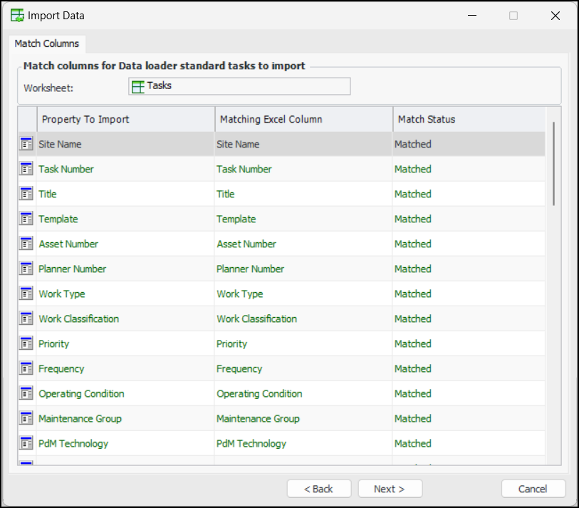 8. Click Next. The Match Columns page lists the properties to import, the columns in the Excel file, and their match statuses. If a column does not match, the row appears in red, and the Match Status column indicates the reason for the error. For example:Tip: In an error row, you can click the Matching Excel Column cell and press F2 to make the cell editable. Then select a column from the import file to match.