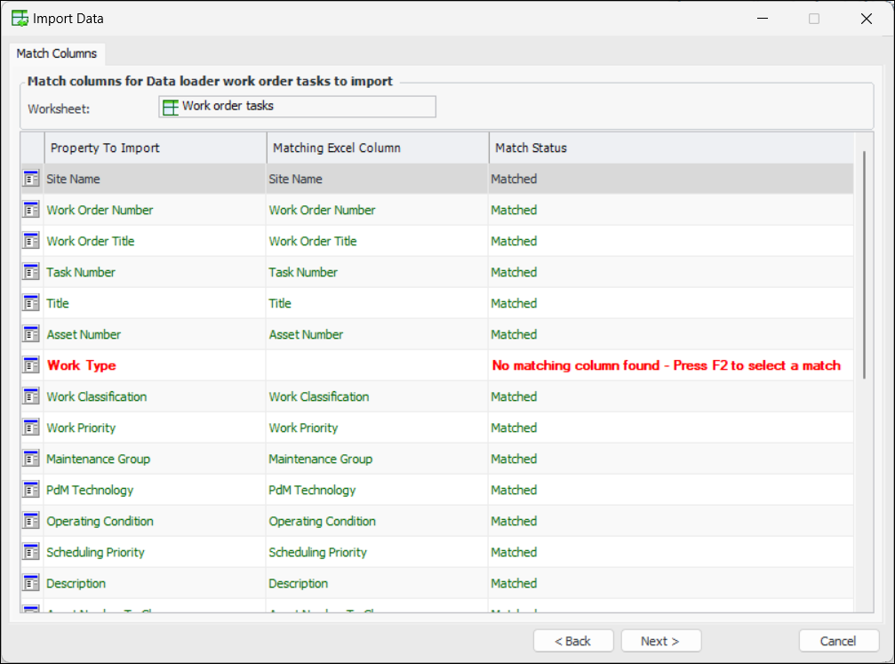 8. Click Next. The Match Columns page lists the properties to import, the columns in the Excel file, and their match statuses. If a column does not match, the row appears in red, and the Match Status column indicates the reason for the error. For example:Tip: In an error row, you can click the Matching Excel Column cell and press F2 to make the cell editable. Then select a column from the import file to match.