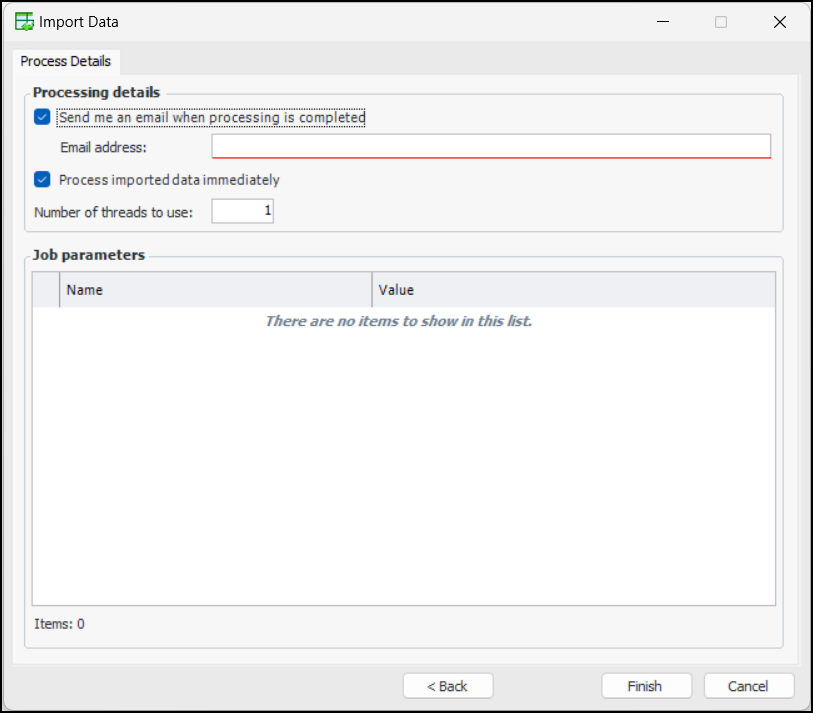 10. Send an email when this job finishes is selected by default. If you would like an email notification to be sent to you or another employee, enter a valid email address in the Email address box.Note: In order for APM to send automatic email notifications, the recipient’s employee record must record the email address and server email settings must include the SMTP host name. For more information, “Setting up Email” in APM Installation Guide.