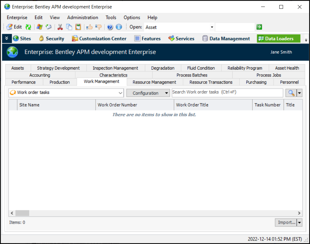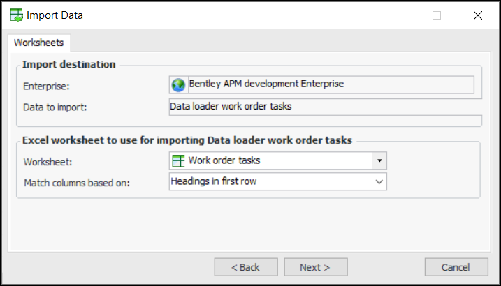 When you wish to populate an APM database with multiple work order tasks, APM data loading provides an alternative to manual data entry: you can import work orders and their tasks from a Microsoft Excel® workbook. You can also update the properties of existing work order tasks using the Import Data wizard.While using the Import Data wizard, you can set an option to process data immediately. If no errors are found in the imported data, the data is added to the specified APM site. If you do not select Process Immediately, the job remains in the process jobs queue until processing is initiated.After the information has been processed, an entry appears in the Data Import Requests tab on the Data Management view. The import worksheet and a results worksheet that includes each record’s import status and error, if any, are attached to the import request.