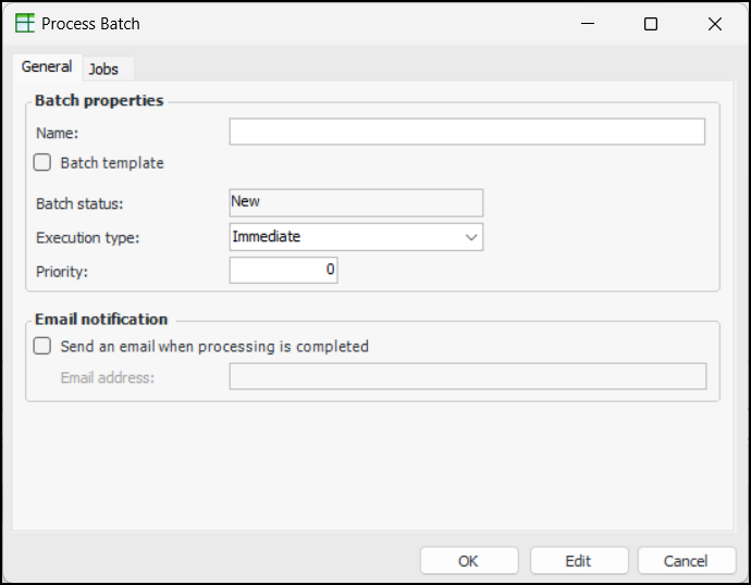 • Select the Jobs tab and click New to create a process job assigned to the batch. You cannot use this method to assign existing process jobs to a batch.Tip: Use the Move Up and Move Down buttons to change the order in which jobs are processed. However, job dependencies take precedence over sequence order.