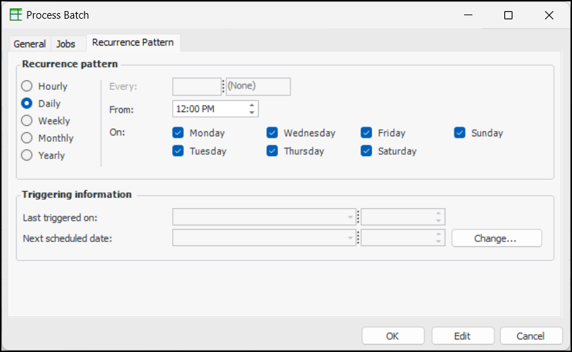 5. Select Batch template if the batch is to be processed at regular intervals. The Recurrence Pattern tab is added to the dialog.