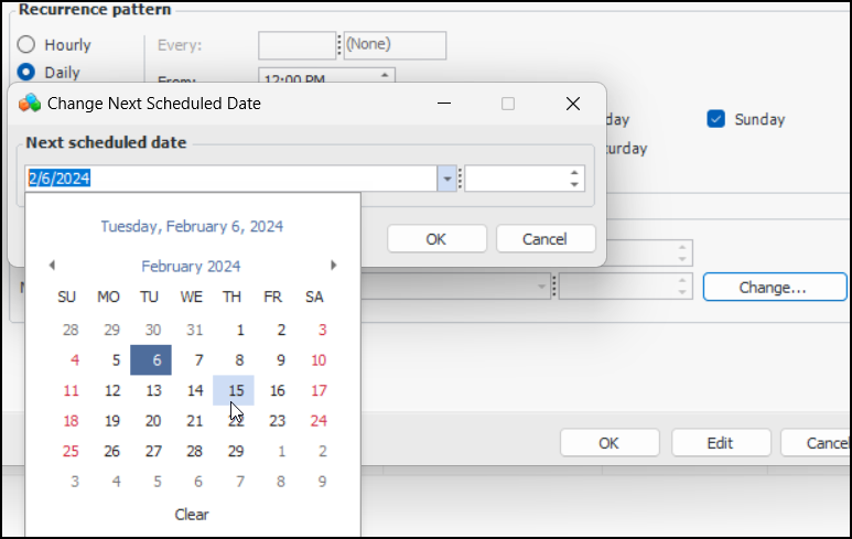 11. Based on your selections, the next scheduled date is calculated. You can set the starting date by clicking Change and selecting a date and time. For example: