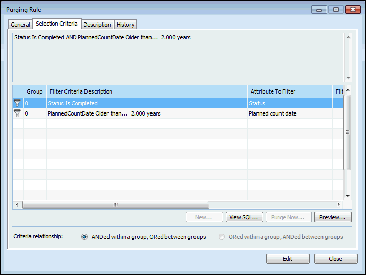 The Selection Criteria tab allows you to work with a purging rule’s criteria in several ways. You can:Viewing the Selection Criteria
