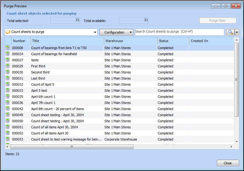 2. Click Close when you are finished viewing the preview.Tip: If the purging rule has been activated, you can purge the instances previewed in the dialog. Click Purge Now in the upper right-hand corner of the dialog. For more information, see Manually Executing a Purging Rule.