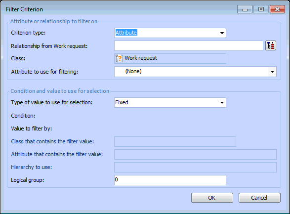 Because purging rules are site-specific, the site is always an implied selection criterion. That is, a purging rule only deletes items for the site or sites to which it applies, regardless of the other selection criteria defined. Every filter criterion starts from the class of objects that you want to select (for example, the Work Request class). You must then select either an attribute or a relationship to use to filter the objects. In most cases, you will base the filter on an attribute (property) of the base class. For example, you might filter a group of work requests based on the WorkRequestStatus attribute. However, you might also use an attribute owned by a related class.Filter Groups